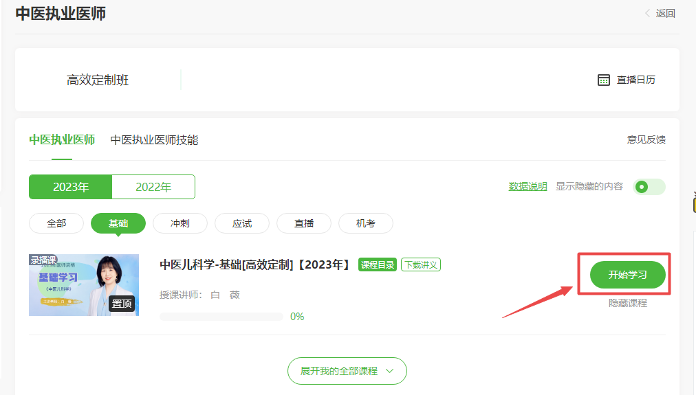 登录学员代码进入我的网校我的家,点击“我的课程”,进入课程,选择“2023年”,即可看到《中医儿科学》课程,点击开始学习即可。