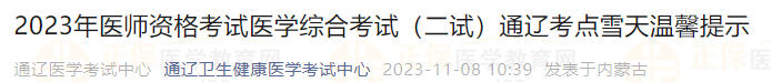 2023中医执业医师“一年两试”考试将于11月11日开考,内蒙古通辽考点官方考点发布了2023年中医执业医师医学综合考试(二试)雪天温馨提示,请各位考生及时查看,做好应试准备!