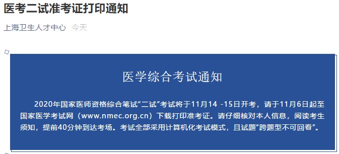 2020年国家医师资格综合笔试“二试”考试将于11月14 -15日开考,请于11月6日起至国家医学考试网(www.nmec.org.cn)下载打印准考证。请仔细核对本人信息,阅读考生须知,提前40分钟到达考场。考试全部采用计算机化考试模式,且试题“跨题型不可回看”。