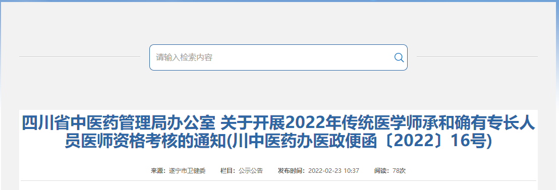 四川省遂宁市卫健委发布“四川省中医药管理局办公室 关于开展2022年传统医学师承和确有专长人员医师资格考核的通知(川中医药办医政便函〔2022〕16号)”通知,为帮助大家了解,在此医学教育网小编为大家整理如下内容: