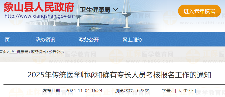 浙江省宁波市象山县2025年传统医学师承和确有专长人员考核报名工作的通知已发布,网上报名时间为2024年12月2日9:00至12月20日17:00,现场确认时间为2024年12月2日—20日(工作日),医学教育网小编整理官方通知如下: