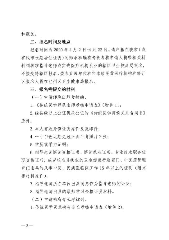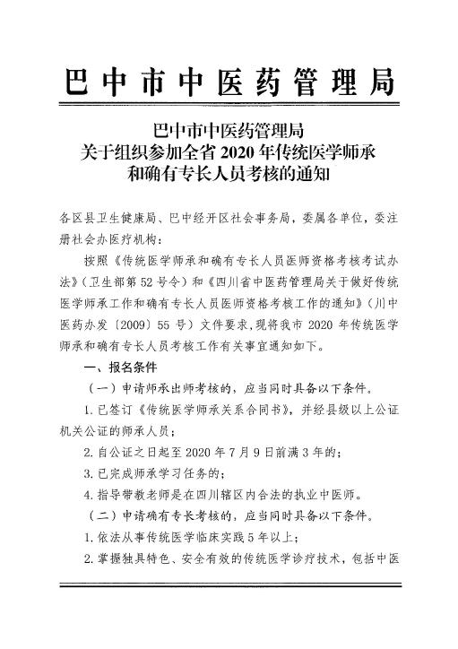 以上是“四川巴中2020年传统医学师承和确有专长人员考核的通知”。