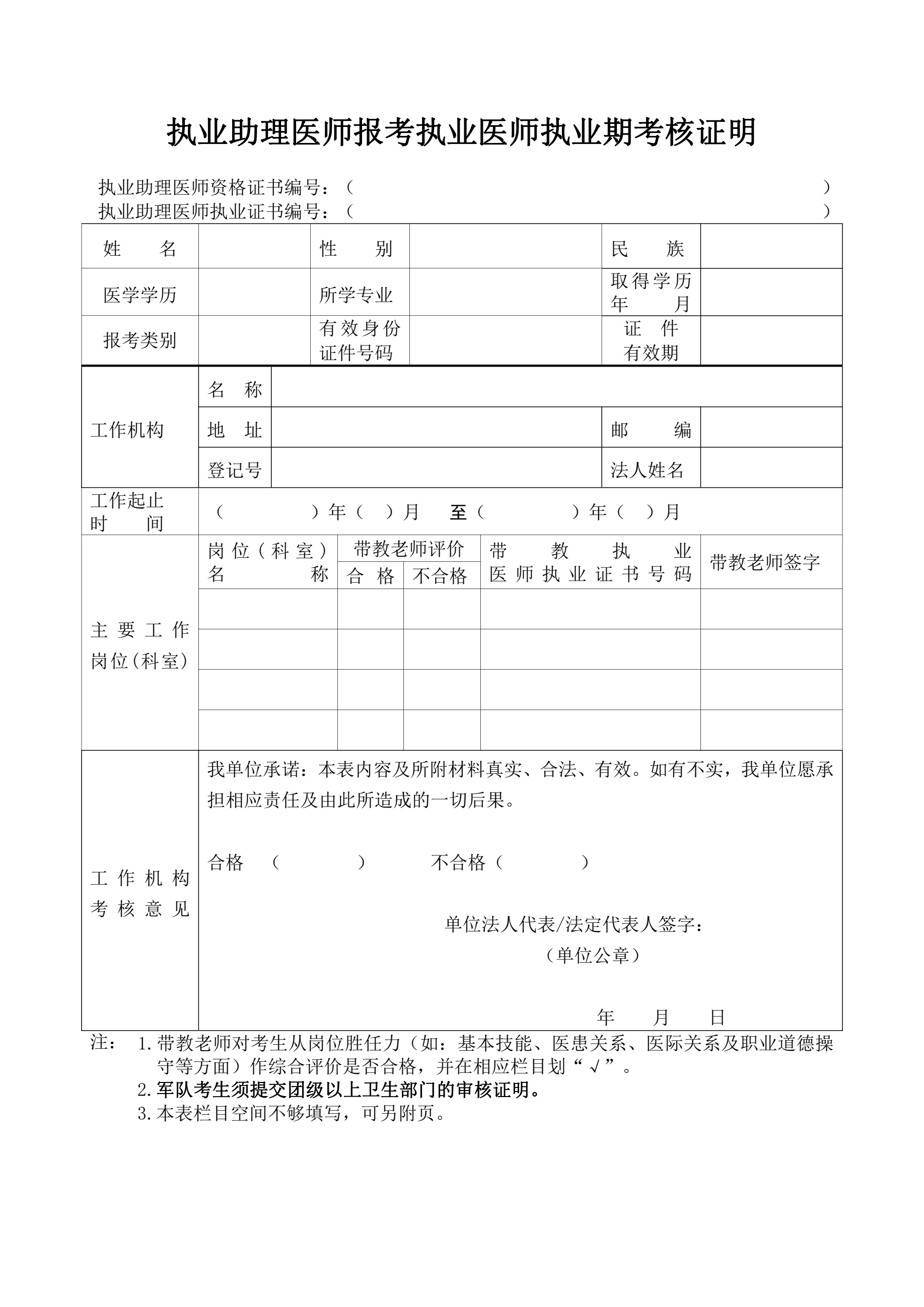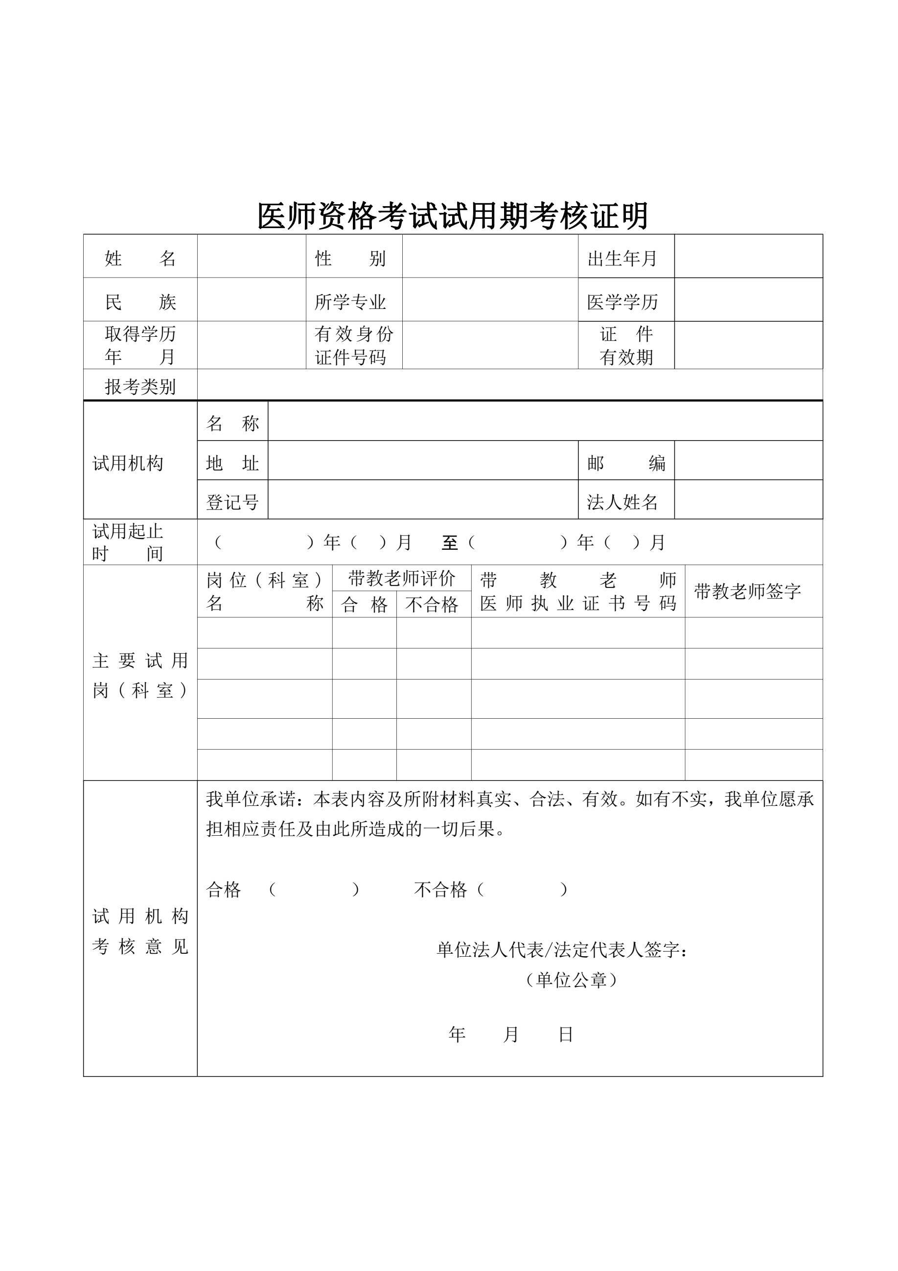【附件下载】 医师资格考试试用期考核证明