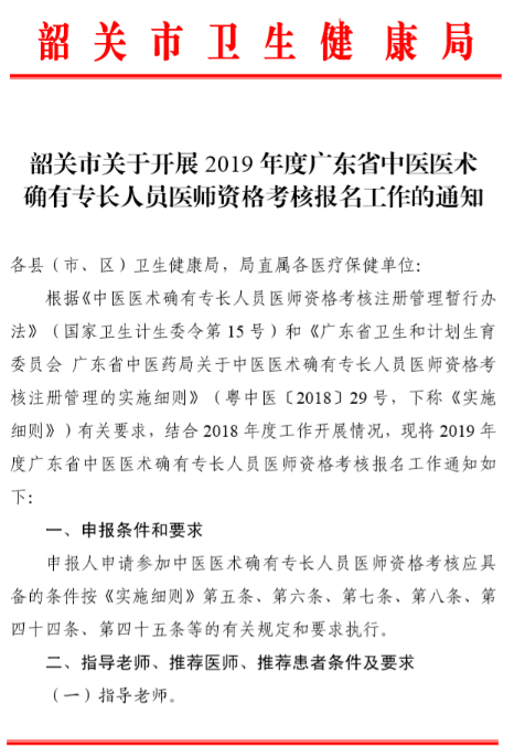 韶关市关于开展2019度广东省中医医术确有专长人员医师资格考核报名工作的通知,为帮助大家了解,在此医学教育网小编为大家整理如下内容: