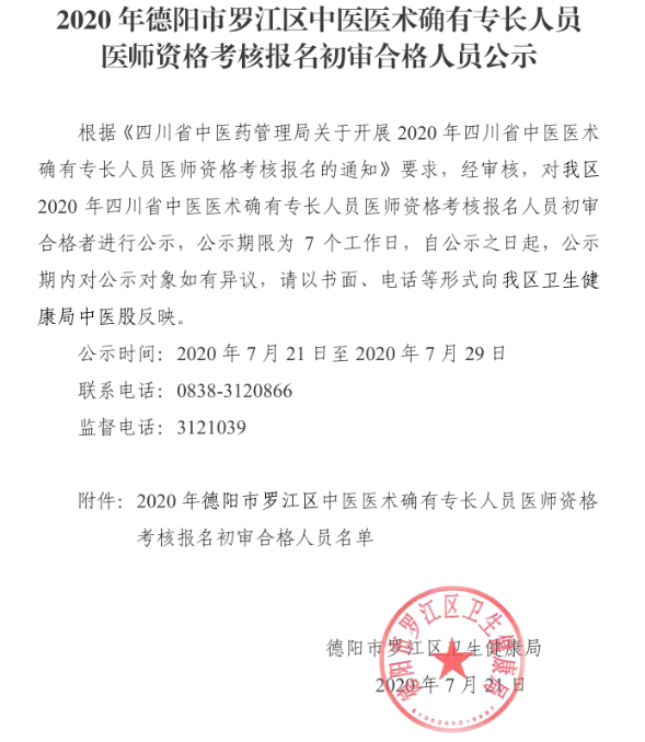 “德阳市罗江区2020年中医医术确有专长人员医师资格考核报名初审人员公示”的内容很多人都想知道,医学教育网小编为此整理了“德阳市罗江区2020年中医医术确有专长人员医师资格考核报名初审人员公示”,详情如下: