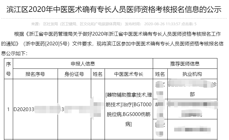 根据《浙江省中医药管理局关于做好2020年浙江省中医医术确有专长人员医师资格考核报名工作的通知》(浙中医药[2020]5号)文件要求,现将滨江区参加中医医术确有专长人员医师资格考核报名信息公示如下: