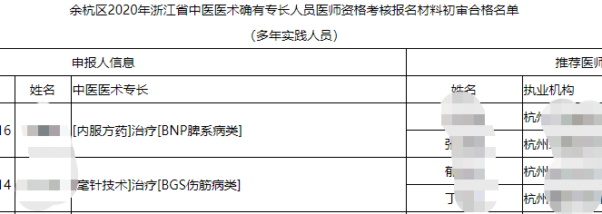 附件:余杭区2020年浙江省中医医术确有专长人员医师资格考核报名材料初审合格名单(多年实践人员)