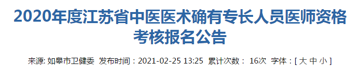 根据省中医药管理局《关于做好2020年度江苏省中医医术确有专长人员医师资格考核报名工作的通知》(苏中医医政函〔2021〕8号)要求,现将我市2020年中医医术确有专长人员医师资格考核报名有关事项公告如下: