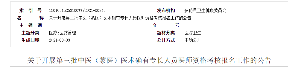 上文“锡林郭勒盟多伦县2021年中医(蒙医)医术确有专长人员医师资格考核报名工作的公告”由医学教育网整理,更多医考信息、政策新闻、备考干货请关注医学教育网。