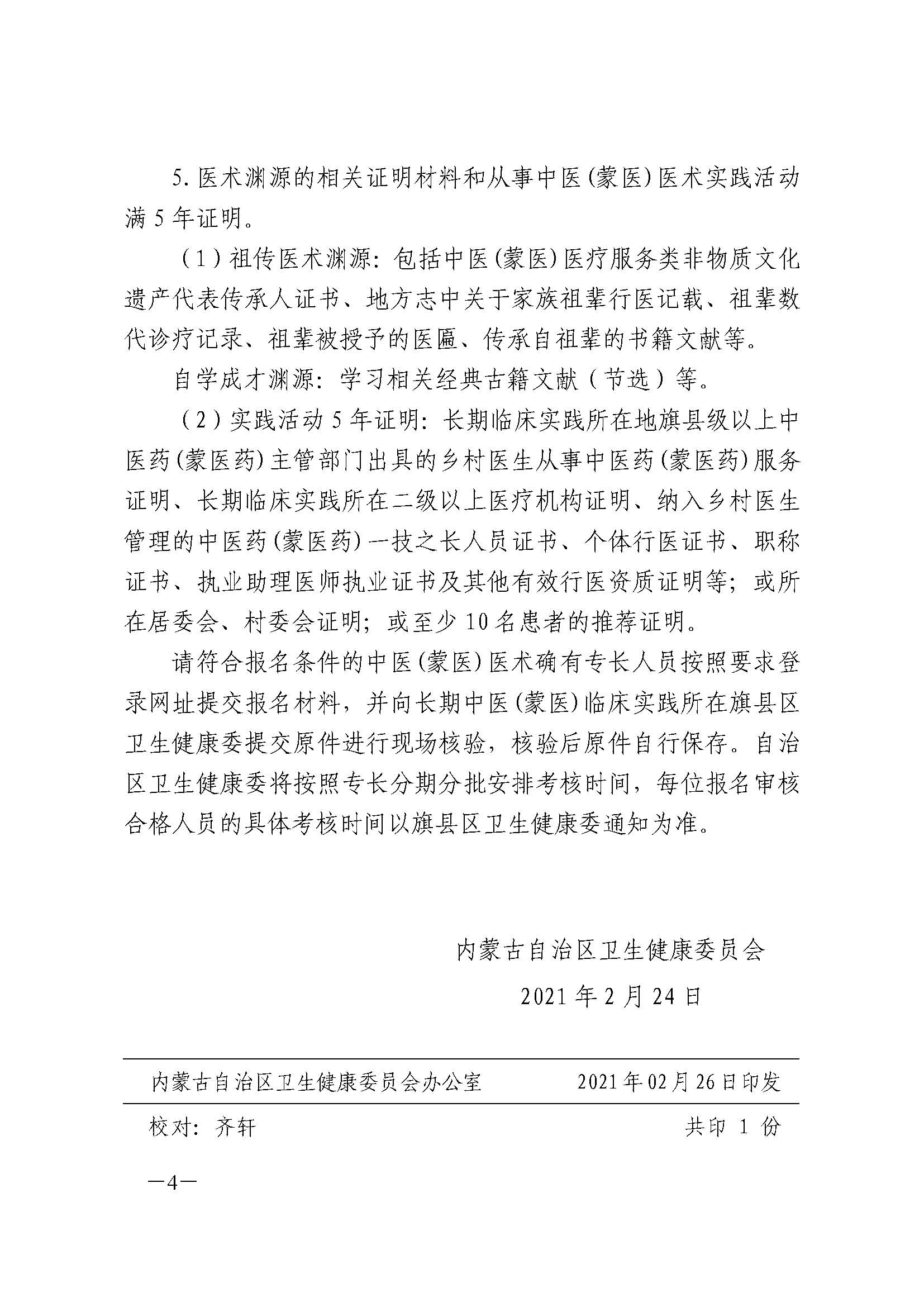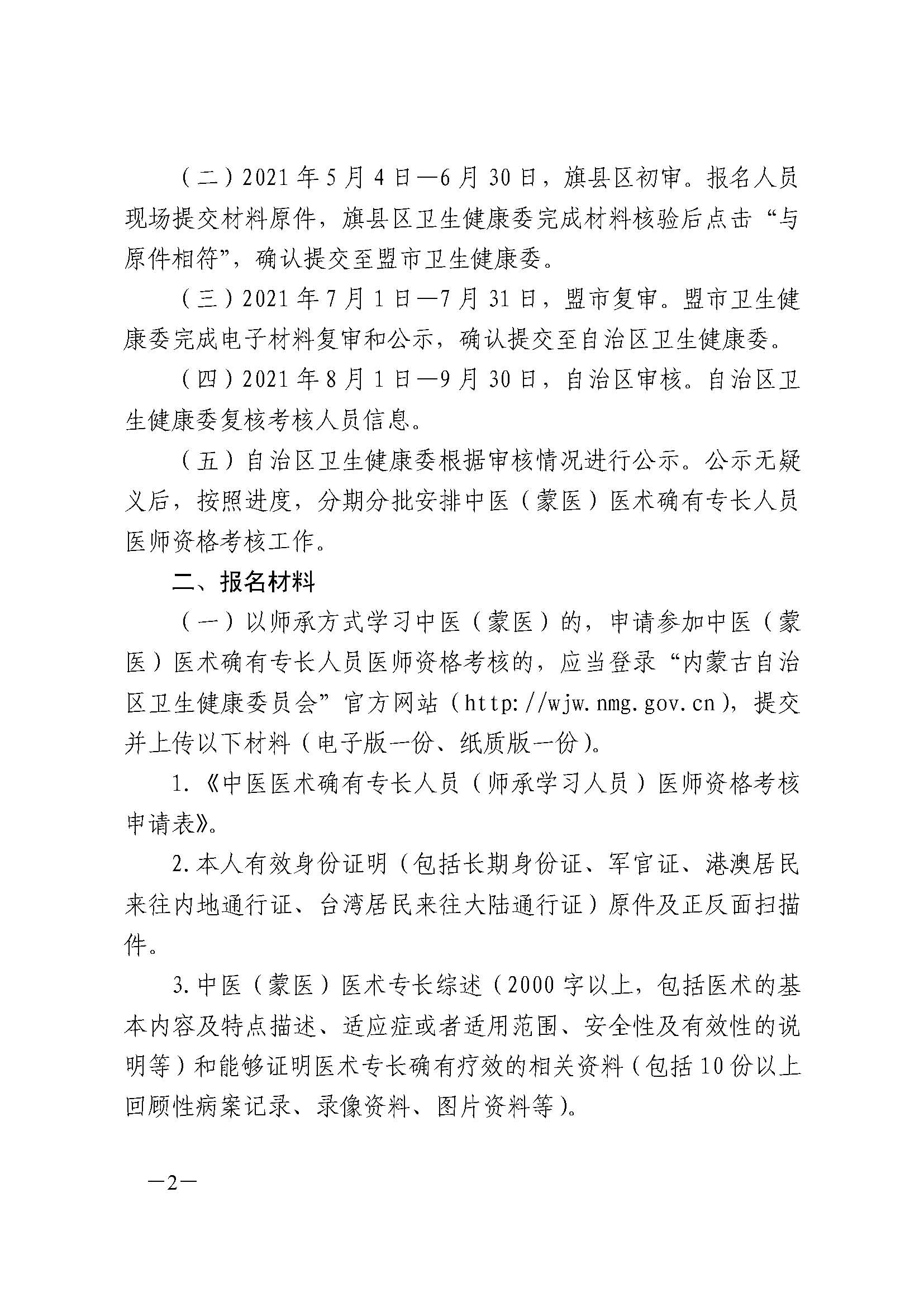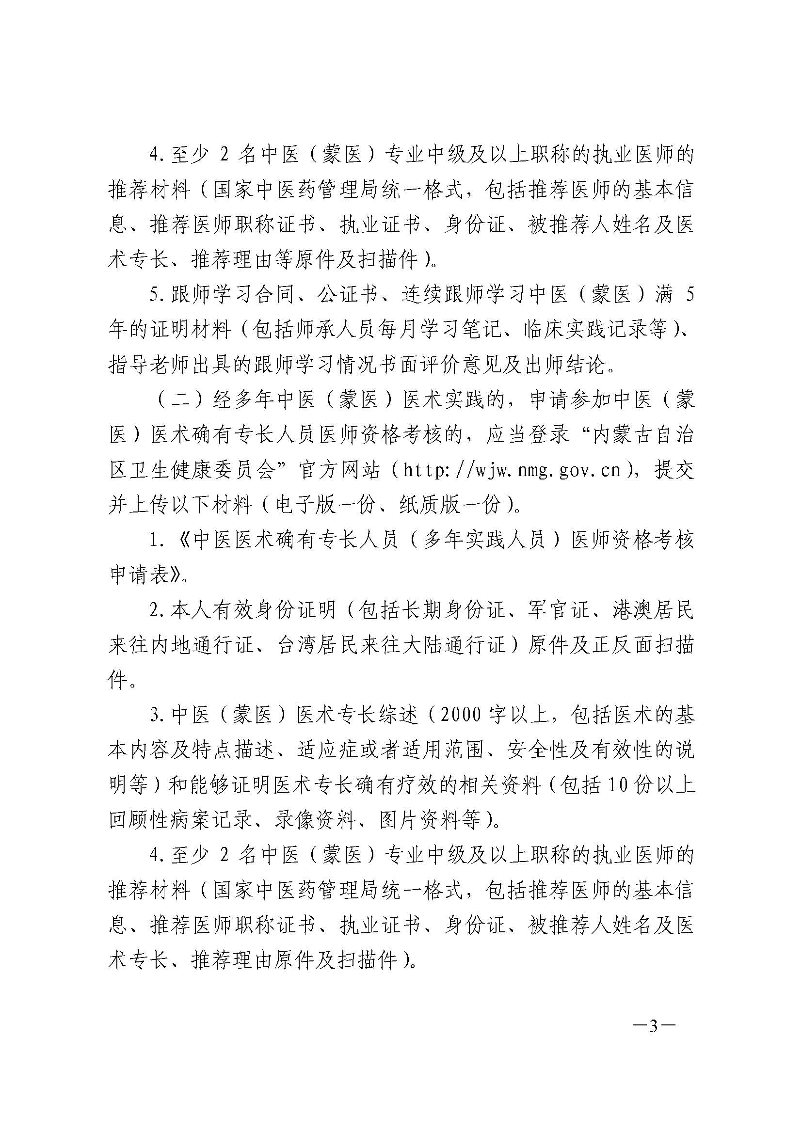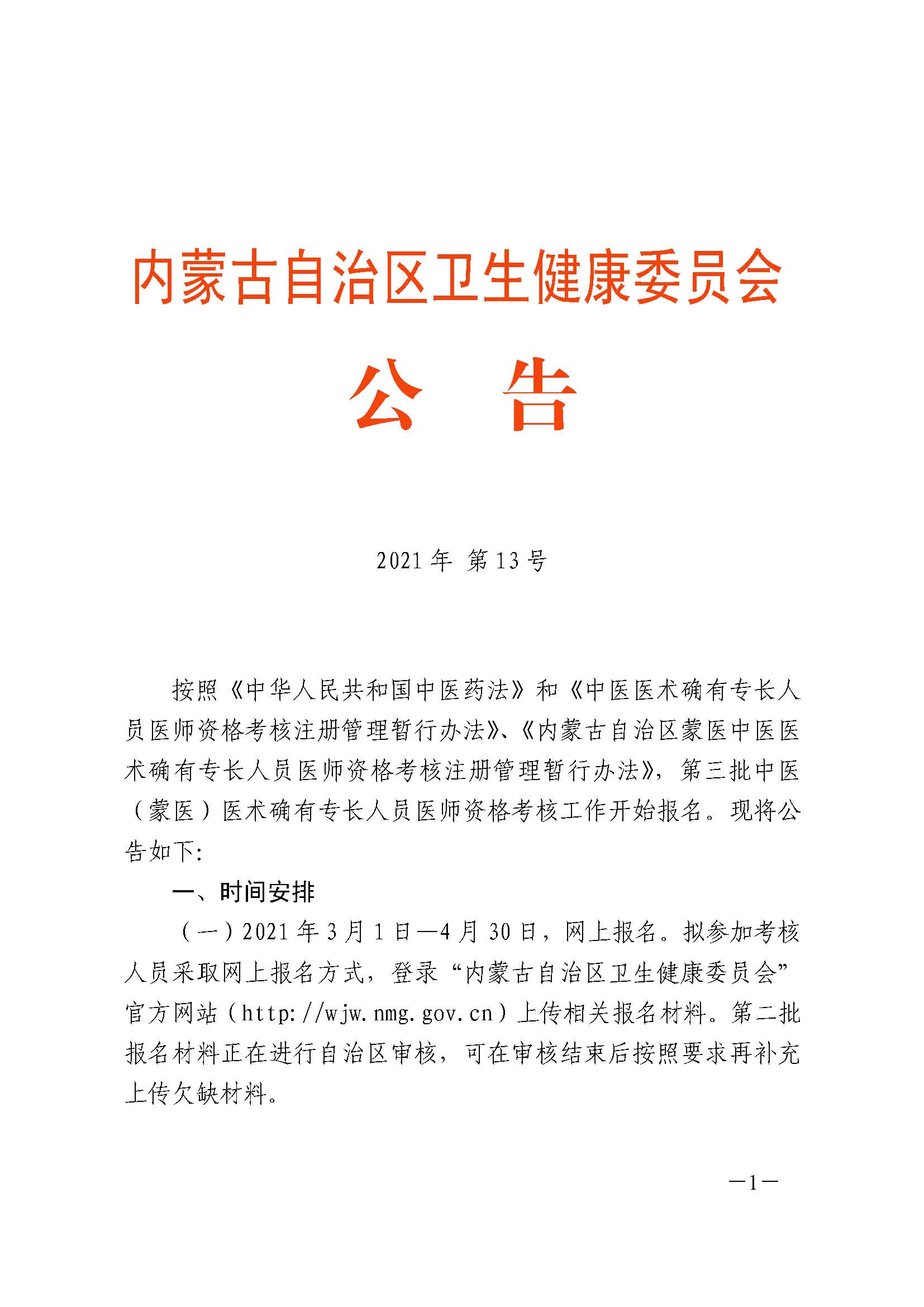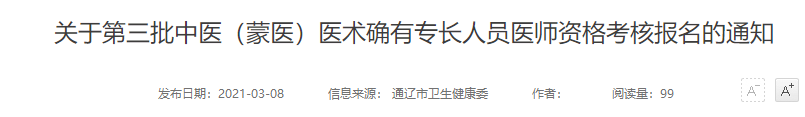 按照《中华人民共和国中医药法》和《中医医术确有专长人员医师资格考核注册管理暂行办法》、《内蒙古自治区蒙医中医医术确有专长人员医师资格考核注册管理暂行办法》,通辽市卫生健康委已开展第三批中医(蒙医)医术确有专长人员医师资格考核报名工作。现将自治区卫健委2021年第13号公告公布如下,请拟参加考核人员严格按照要求进行报名。