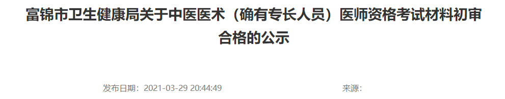 “黑龙江富锦市2020年中医医术确有专长人员医师资格考核报名初审合格名单”的内容很多人都想知道,医学教育网小编为此整理了“黑龙江富锦市2020年中医医术确有专长人员医师资格考核报名初审合格名单”,详情如下: