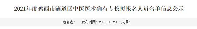 按照《黑龙江省中医医术确有专长人员医师资格考核注册管理实施细则》(黑卫中医规发〔2018〕32号)文件要求,将鸡西市滴道区中医医术确有专长拟报名人员信息公示如下: