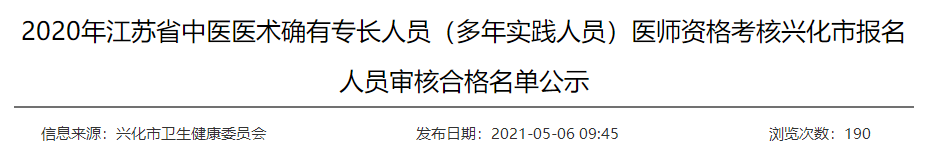 2020年江苏省中医医术确有专长人员医师资格考核兴化市报名工作经过网上报名、现场确认、县级市初审,按照《2020年江苏省中医医术确有专长人员医师资格考核报名指南》、《中医医术确有专长人员医师资格考核报名审核要点》,现将合格人员名单公示如下,如有异议,请于7天之内实名联系兴化市卫健委医政(中医)科,联系电话:0523-83316571