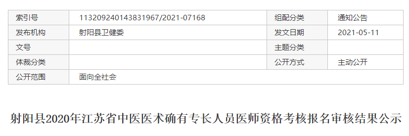 根据《关于做好2020年度江苏省中医医术确有专长人员医师资格考核报名工作的通知》(苏中医医政函〔2021〕8号文件)精神及相关会议要求,经审核,我县符合2020年度江苏省中医医术确有专长人员医师资格考核报名条件的共1人,现将初审拟通过人员信息予以公示(见附件)。 任何单位或个人如有异议,请在公示发布后5个工作日内,向射阳县卫健委医政中医科书面反映,凡以单位反映情况的材料要加盖公章,以个人反映情况的材料要署实名。