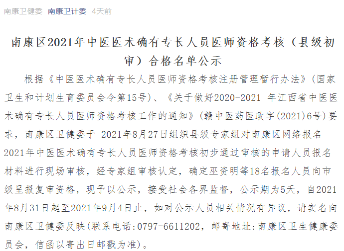 根据《中医医术确有专长人员医师资格考核注册管理暂行办法》(国家卫生和计划生育委员会令第15号)、《关于做好2020-2021 年江西省中医医术确有专长人员医师资格考核工作的通知》(赣中医药医政字(2021)6号)要求,南康区卫健委于 2021年8月27日组织县级专家组对南康区网络报名2021年中医医术确有专长人员医师资格考核初步通过审核的申请人员报名材料进行现场审核,经专家组审核认定,确定巫资明等18名报名人员向市级呈报复审资格,现予以公示,接受社会各界监督,公示期为5天,自2021年8月31日起至2021年9月4日止,如对公示人员相关情况有异议,请实名向南康区卫健委反映(联系电话:0797-6611202,邮寄地址:南康区卫生健康委员会,信函以寄出日邮戳为准)。