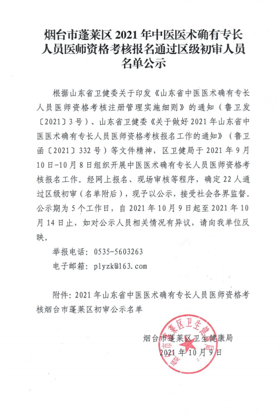 烟台市蓬莱区发布了2021年中医医术确有专长人员医师资格考核报名通过初审人员,具体通知内容医学教育网小编搜集整理如下: