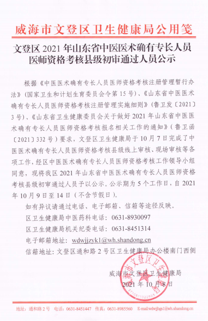 威海市文登区发布了2021年中医医术确有专长人员医师资格考核县级初审通过人员,具体通知内容医学教育网小编搜集整理如下:
