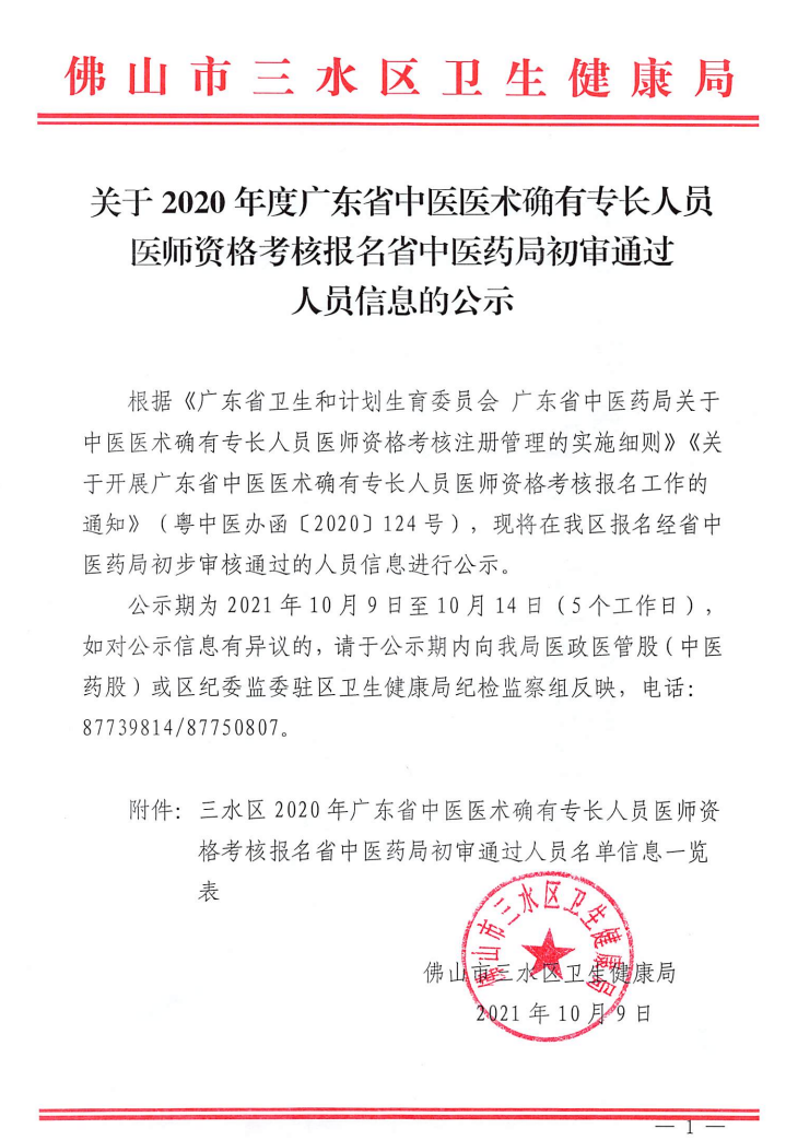 佛山市三水区发布了关于2020年中医医术确有专长人员医师资格考核报名初审名单,具体通知内容医学教育网小编搜集整理如下: