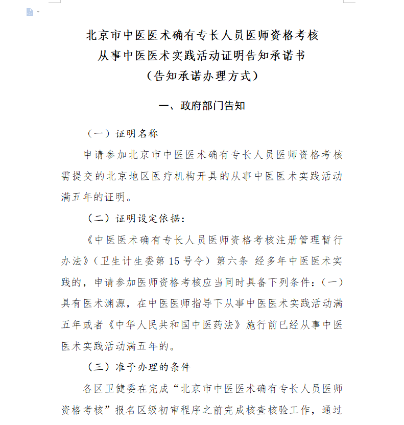 附件下载: 《北京市中医医术确有专长人员医师资格考核从事中医医术活动实践证明)(告知承诺办理方式)