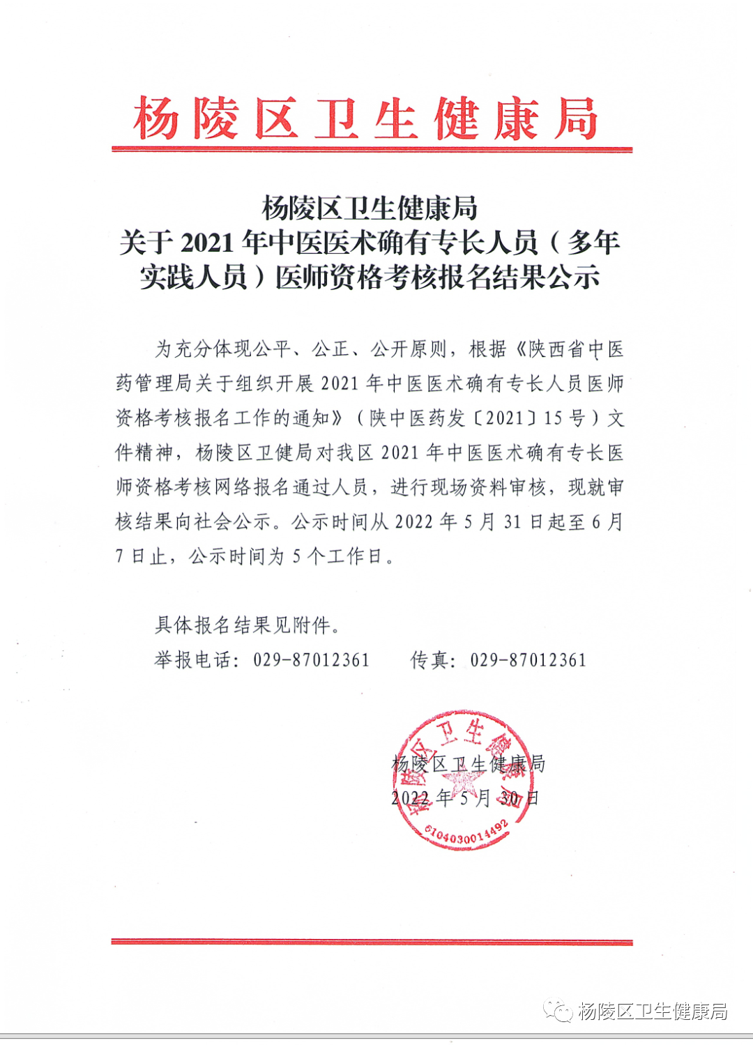 为充分体现公平、公正、公开原则,根据《陕西省中医药管理局关于组织开展2021年中医医术确有专长人员医师资格考核报名工作的通知》(陕中医药发〔2021〕15号)文件精神,杨陵区卫健局对我区2021年中医医术确有专长医师资格考核网络报名通过人员,进行现场资料审核,现就审核结果向社会公示如下:
