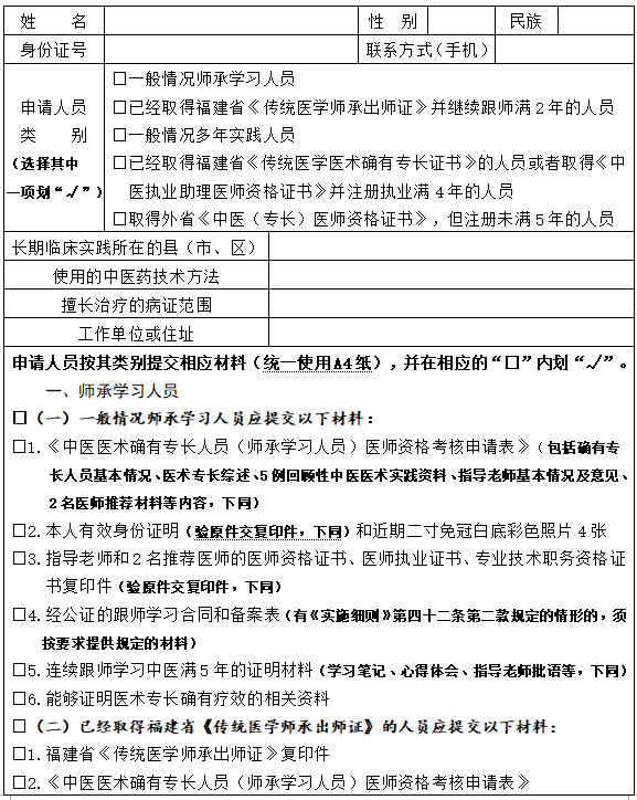 附件下载: 福建省中医医术确有专长人员医师资格考核申报资料一览表