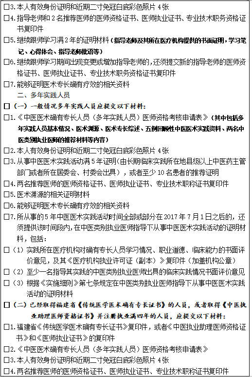 福建省中医医术确有专长人员医师资格考核申报资料一览表