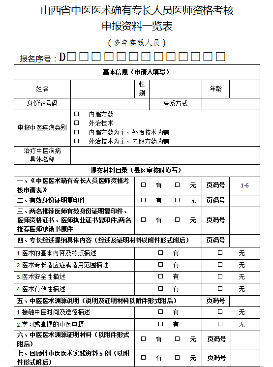 关于“多年实践人员报考山西省中医专长考核申报资料一览表”相关内容,相信参加中医医术确有专长人员医师资格考核的考生都想知道,为方便大家了解,在此医学教育网小编为大家整理如下内容: