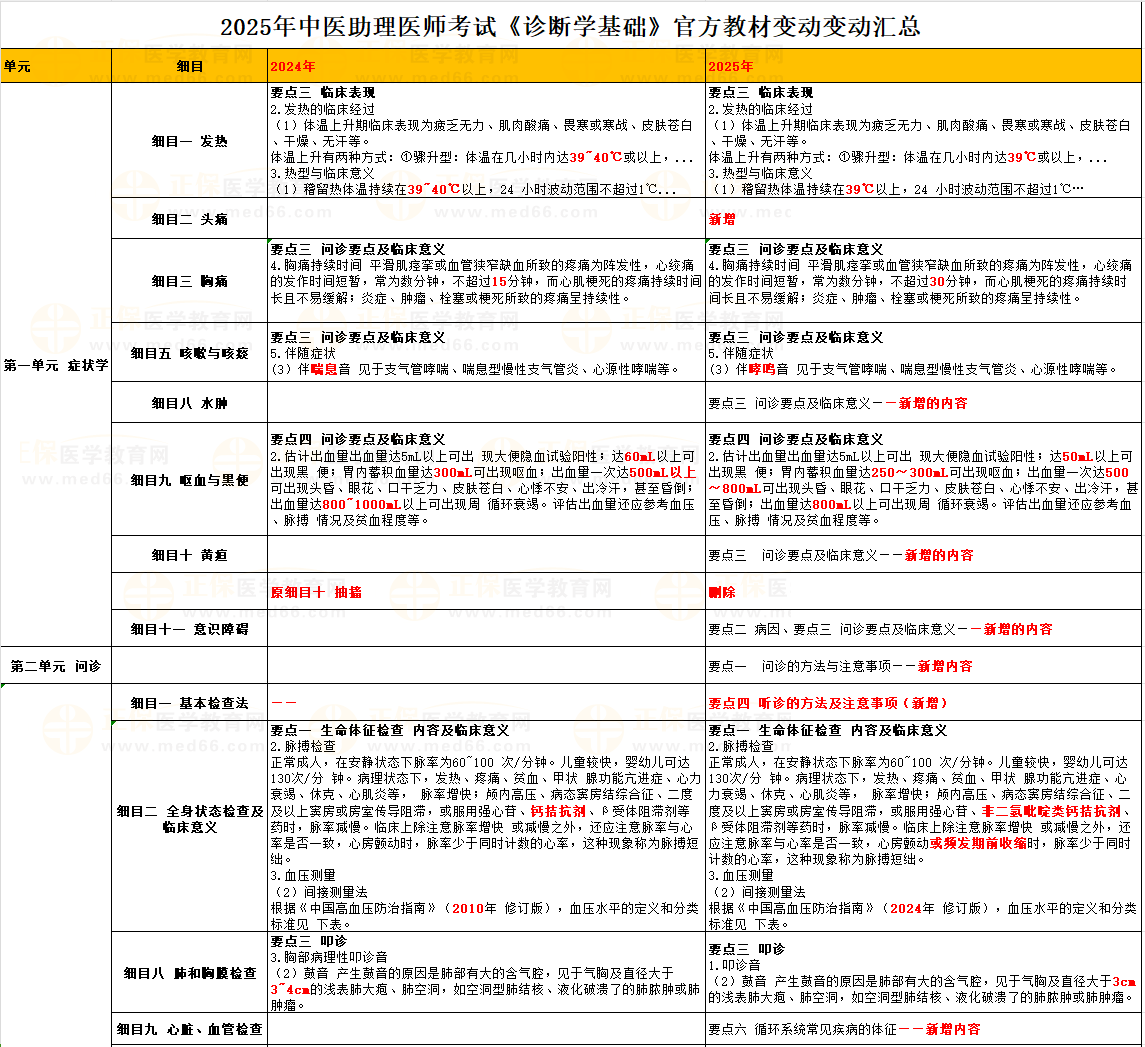 2025年国家中医执业助理医师资格考试《诊断学基础》官方教材已发布,医学教育网专业老师为大家梳理变动内容如下: