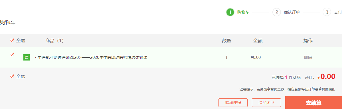 第一步、点击“去结算”,完成订单。