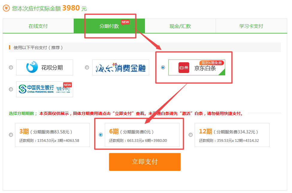 注意事项:只有6期分期购买服务费为0元,其他期数暂时没有优惠。