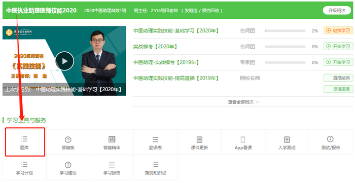 医学教育网技能特色班题库开通了中医助理医师实践技能考试题库,考生们赶快按照如下步骤进入做题吧!还未购买课程的考生,点击查看课程详情>>