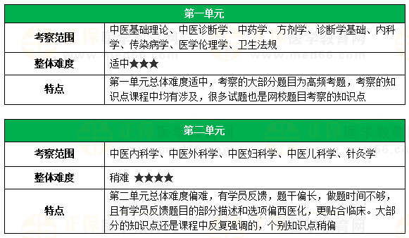 第一单元考察范围:中医基础理论、中医诊断学、中药学、方剂学、诊断学基础、内科学、传染病学、医学了伦理学、卫生法规