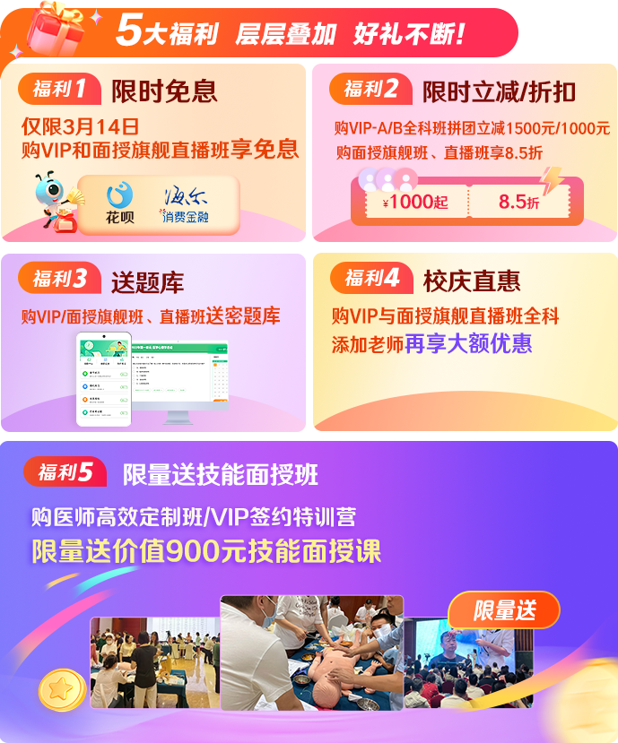 (1)活动期内超值精品班、无忧实验班、高效定制班、技能集训营、技能特色班、卫生招聘、实用技术(含证书)、助考之星,享8.5折优惠;医师资格辅导课程在8.5折基础上可叠加300元券包。券包使用说明: