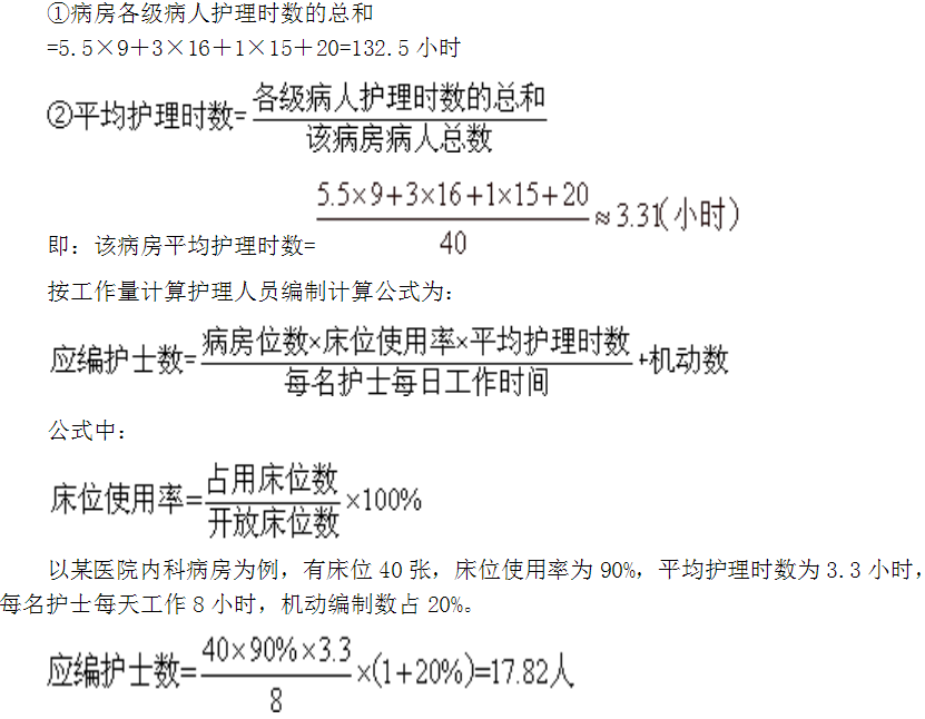 【例题】某病房病人总数为40人,其中:一级护理9人;二级护理16人;三级护理15人。经测定,各级护理中每名患者在24小时内所需的平均护理时数分别为:5.5小时、3小时、1小时。按一个病房40张床测算,一日间接护理项目所需时间为20小时。
