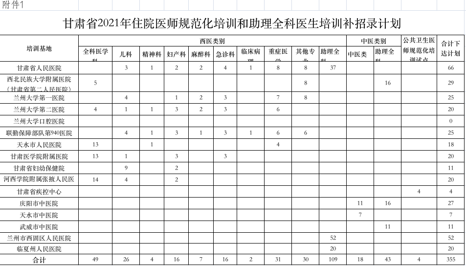 附件:甘肃省2021年住院医师规范化培训和助理全科医生培训招生补招录计划
