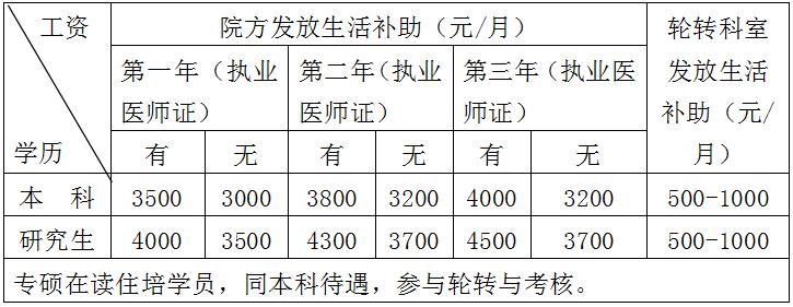 (2)社会人:生活补助由院方补助和轮转科室补助两部分构成。