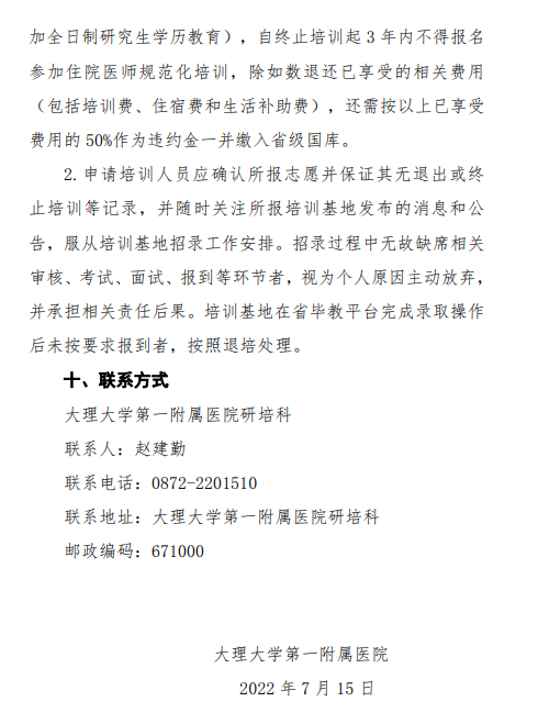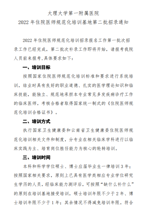 相关附件: 大理大学第一附属医院2022年住院医师规范化培训基地第二批招录通知