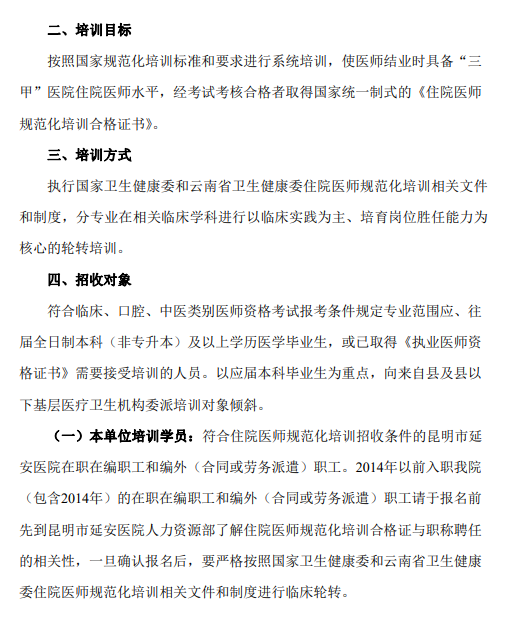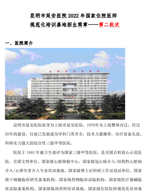 相关附件:昆明市延安医院第二批次2022年国家住院医师规范化培训基地招生简章