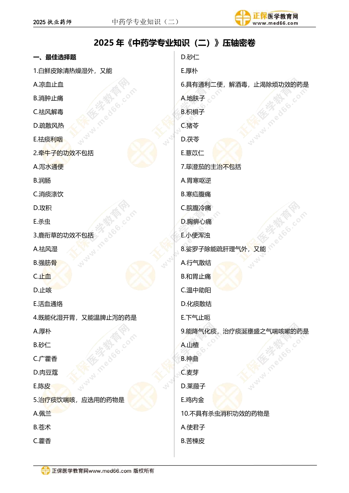 2025《中药学专业知识二》压轴密卷