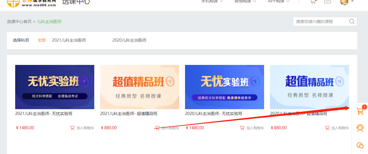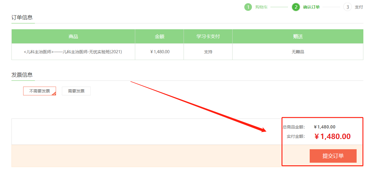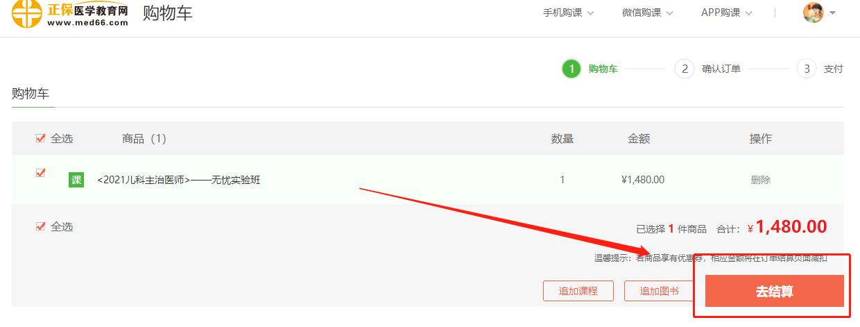 在购物车内确认已选课程,确认无误后点击“去结算”;