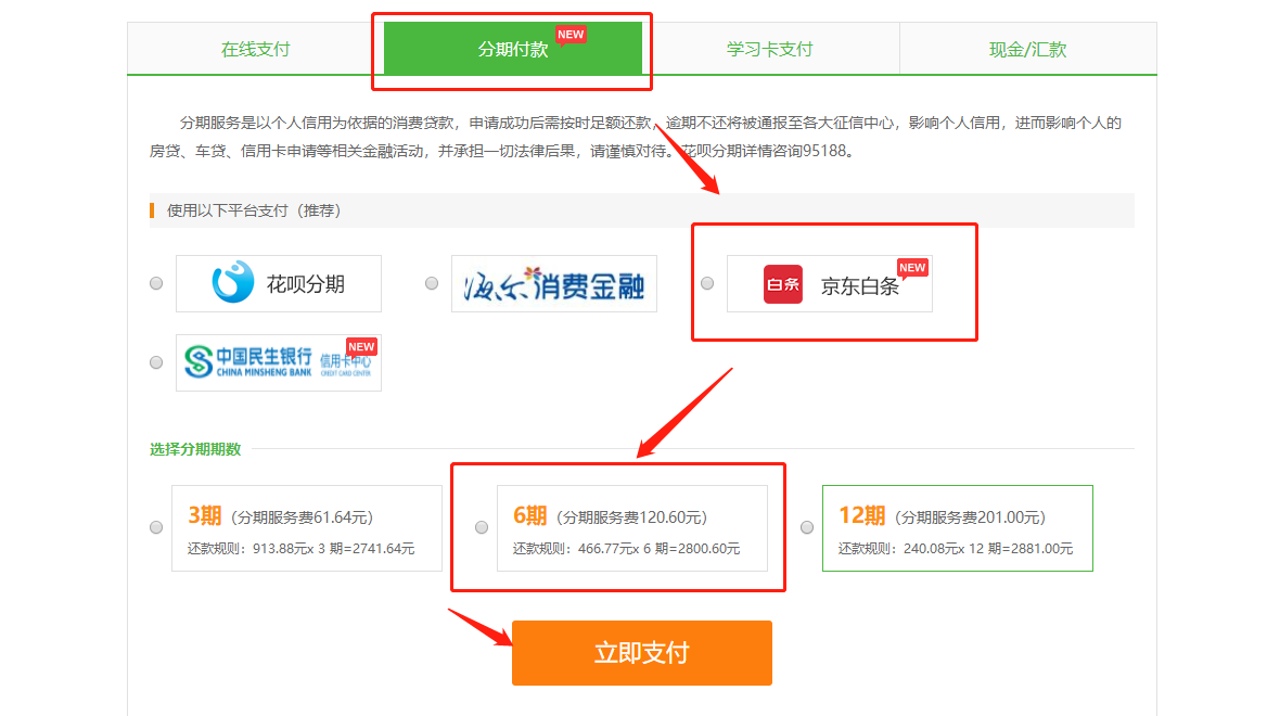 在支付页面,选择分期付款-京东白条进行支付,分期期数一定要选择6期哦!
