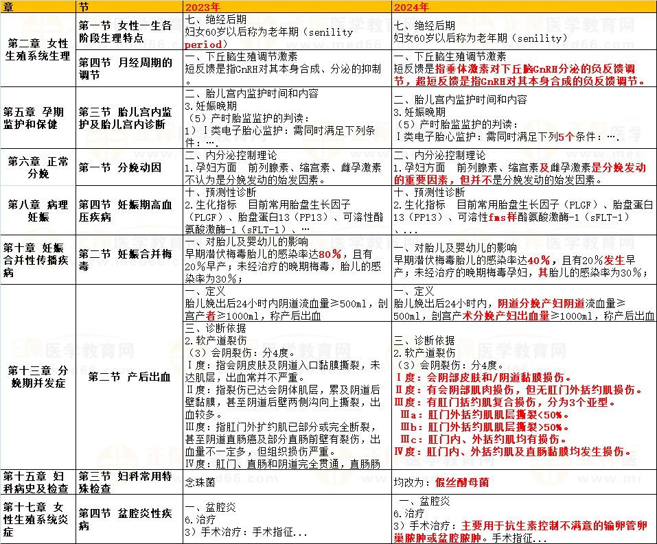 2024年妇产科主治医师考试教材公布了,经医学教育网专业教务校对发现了部分变动,具体内容如下 :