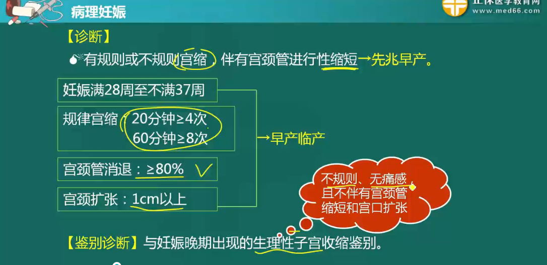 早产是指妊娠满28周至不足37周(196~258日)间分娩者。早产占分娩总数的5%~15%。此时娩出的新生儿称为早产儿,体重为1000~2499g,各器官发育尚不够健全,存活率低下。在妇产科主治医师的考试中病因会在科目二中考察,临床表现及诊断和治疗会在科目三中考察到。需要学员灵活掌握。