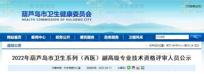 按照省卫生健康委员会《关于做好2022年全省卫生系列高级专业技术资格评审工作的通知》(辽卫发〔2022〕137号)等有关文件精神,结合我市卫生健康工作实际,经葫芦岛市卫生系列专业技术资格考试和高级评审工作领导小组研究通过,现将2022年葫芦岛市卫生系列(西医)副高级专业技术资格评审人员予以公示,公示时间为2023年9月11日至9月15日。