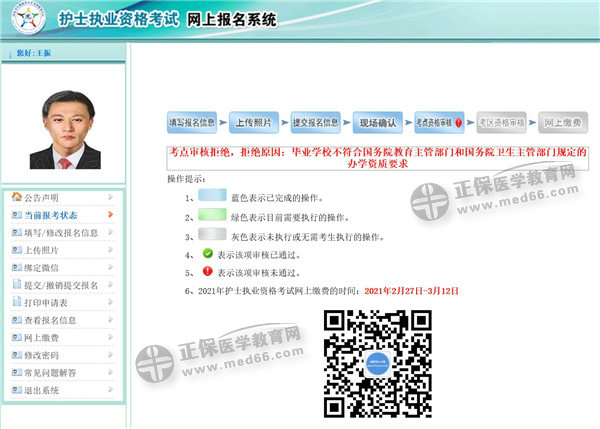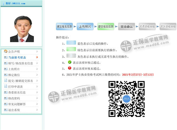 提醒!完成报名以及现场审核的21护士考生记得关注报考状态!通过报考状态可以查看当前考区资格审核状态以及未通过原因,没有通过的考生可以尽快修改报名资料,通过的考生可以准备网上缴费。