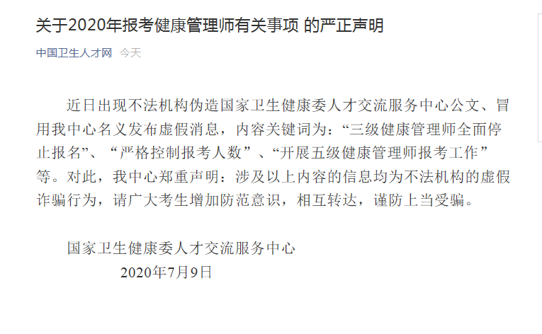 对此卫健委特地发布《关于2020年报考健康管理师有关事项的严正声明》,一起来看看吧!