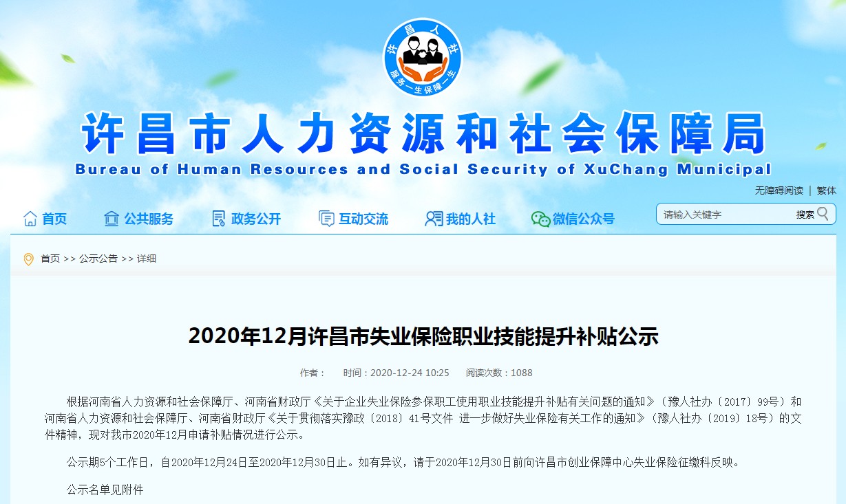 根据河南省人力资源和社会保障厅、河南省财政厅《关于企业失业保险参保职工使用职业技能提升补贴有关问题的通知》(豫人社办﹝2017﹞99号)和河南省人力资源和社会保障厅、河南省财政厅《关于贯彻落实豫政﹝2018﹞41号文件 进一步做好失业保险有关工作的通知》(豫人社办﹝2019﹞18号)的文件精神,现对我市2020年12月申请补贴情况进行公示。
