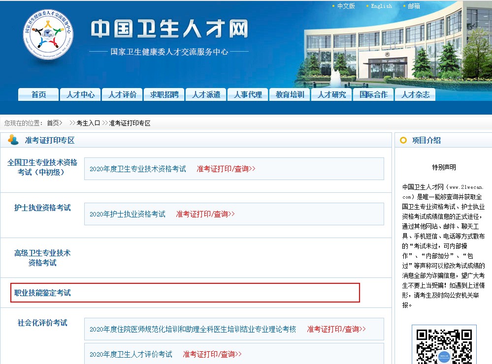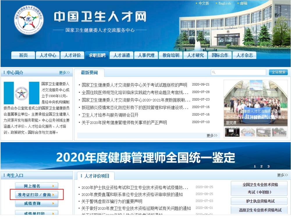 1、登录中国卫生人才网(http://www.21wecan.com),选择“首页”中的【准考证打印/查询】;