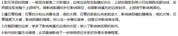 9.做蜡型与雕刻蜡型:蜡型的厚度直接关系到基托的厚度,影响着患者的感觉与基托的强度;蜡型的外形直接关系到基托的外形,影响着患者的感觉与基托的固位。