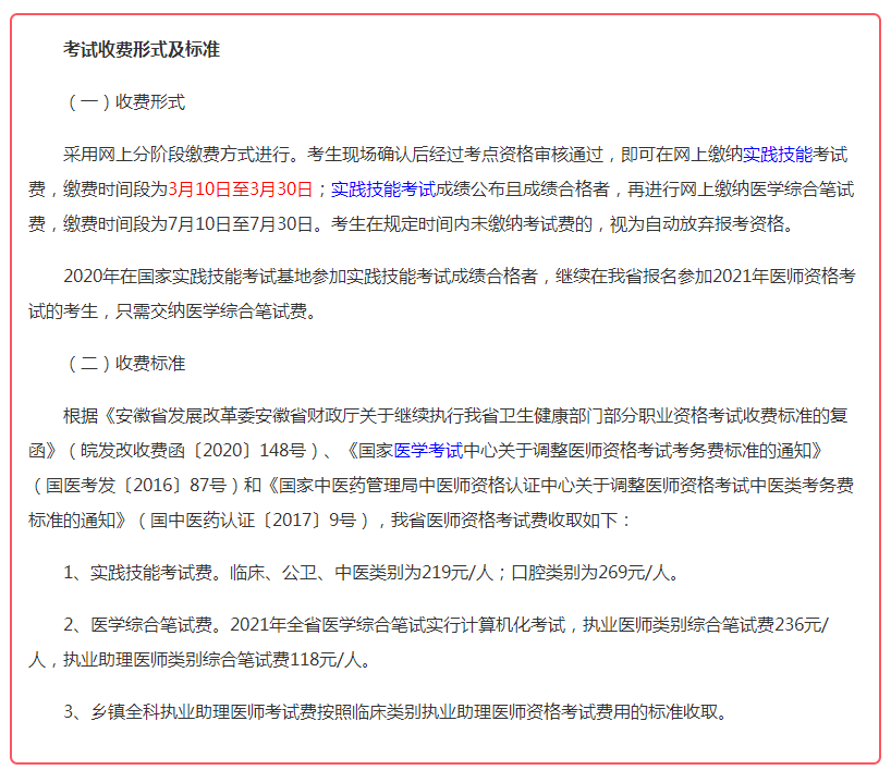 根据《安徽省发展改革委安徽省财政厅关于继续执行我省卫生健康部门部分职业资格考试收费标准的复函》(皖发改收费函〔2020〕148号)、《国家医学考试中心关于调整医师资格考试考务费标准的通知》(国医考发〔2016〕87号)和《国家中医药管理局中医师资格认证中心关于调整医师资格考试中医类考务费标准的通知》(国中医药认证〔2017〕9号),我省医师资格考试费收取如下: